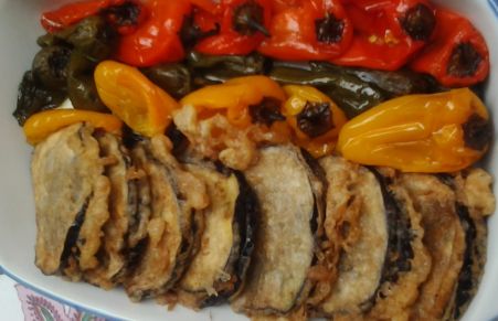 discos de berenjenas rellenos de paté de la sierra de Cameros, albardados y con pimientos confitados
