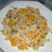 Se cuece el arroz. Se pone en una sartén el maiz para que se haga un poco, después se añade el jamón york en t...
