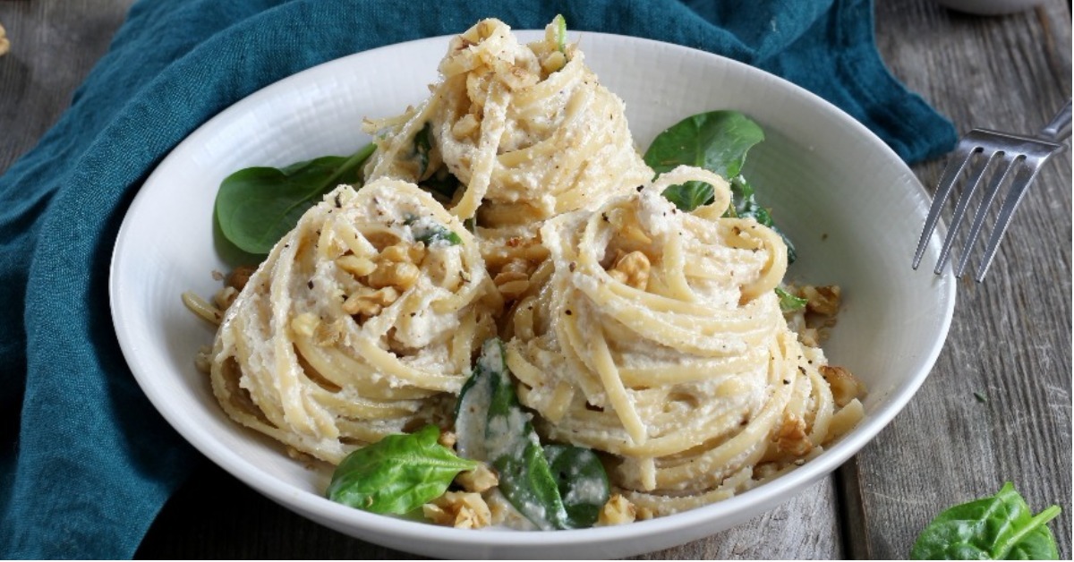 Nidos de pasta en crema de nueces y espinaca, una cena rápida y llena de sabor