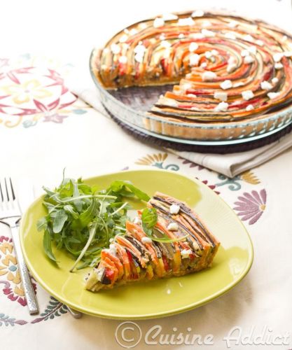 Aparte, bate un huevo en un cuenco y añade un poquito de sal, tomillo y pimienta, una cucharada de mostaza de Dijon y el queso de untar. Mezcla hasta que quede uniforme. Saca el molde del horno, deja unos minutos que temple y añade unas 3/4 partes de la mezcla de queso y huevo, repartiendo bien por el fondo. Reserva el resto. Empieza a enrollar las verduras alrededor, empezando por el exterior. Alterna los colores para que quede más vistoso. Cuando hayas rellenado todo el molde, espovorea con un poquito de sal y vierte por encima la mezcla de queso y huevo que habías reservado. Mete en el horno durante unos 30-40 minutos, hasta que el borde de la masa esté dorado, vigilando que las verduras no se tuesten (porque perderán su colores).