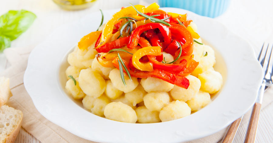 Deliciosos ñoquis italianos con salsa de pimiento y romero