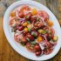 - Dispón las verduras sobre una bandeja ligeramente engrasada. Agrega los camarones.