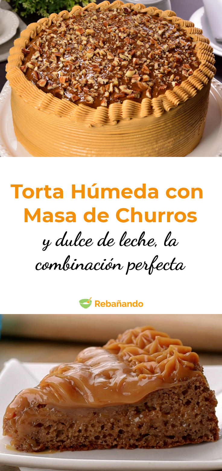 Deliciosa torta húmeda con masa de churros y dulce de leche