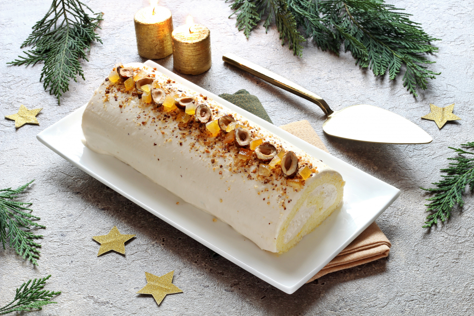 Es un brazo de gitano relleno de una crema de turrón, decorado en forma de tronco navideño cubierto de chocolate blanco, y decorado con avellanas.