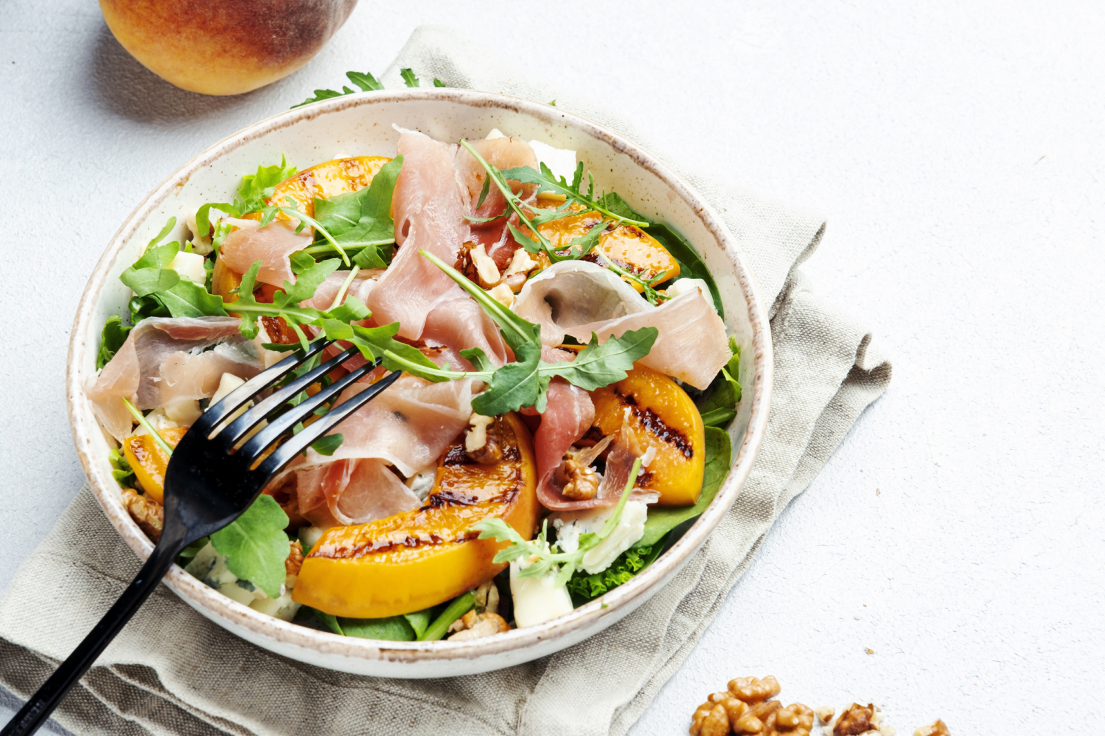Ensalada de melocotón a la parrilla y prosciutto con vinagreta de balsámico blanco