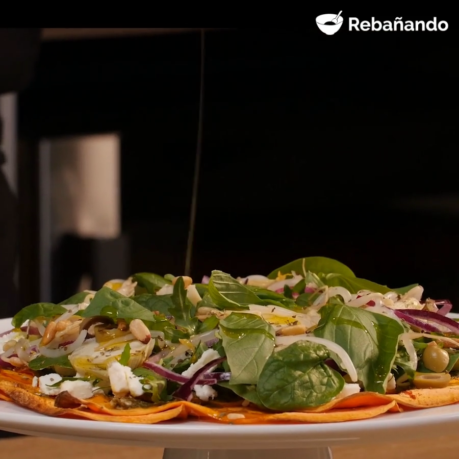 Sucumbe al antojo de manera saludable con esta crujiente pizza de boniato con verduras.