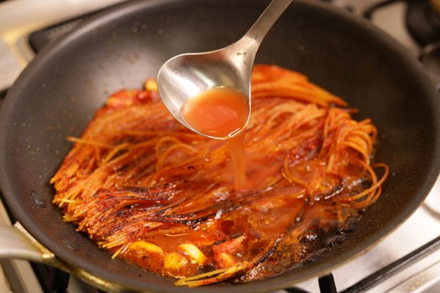 - Seguir cociendo a fuego lento hasta que los espaguetis estén ligeramente dorados. Añadir poco a poco la pasta de tomate disuelta en agua, cucharón a cucharón, en cuanto la pasta haya absorbido el líquido y el conjunto esté demasiado seco.