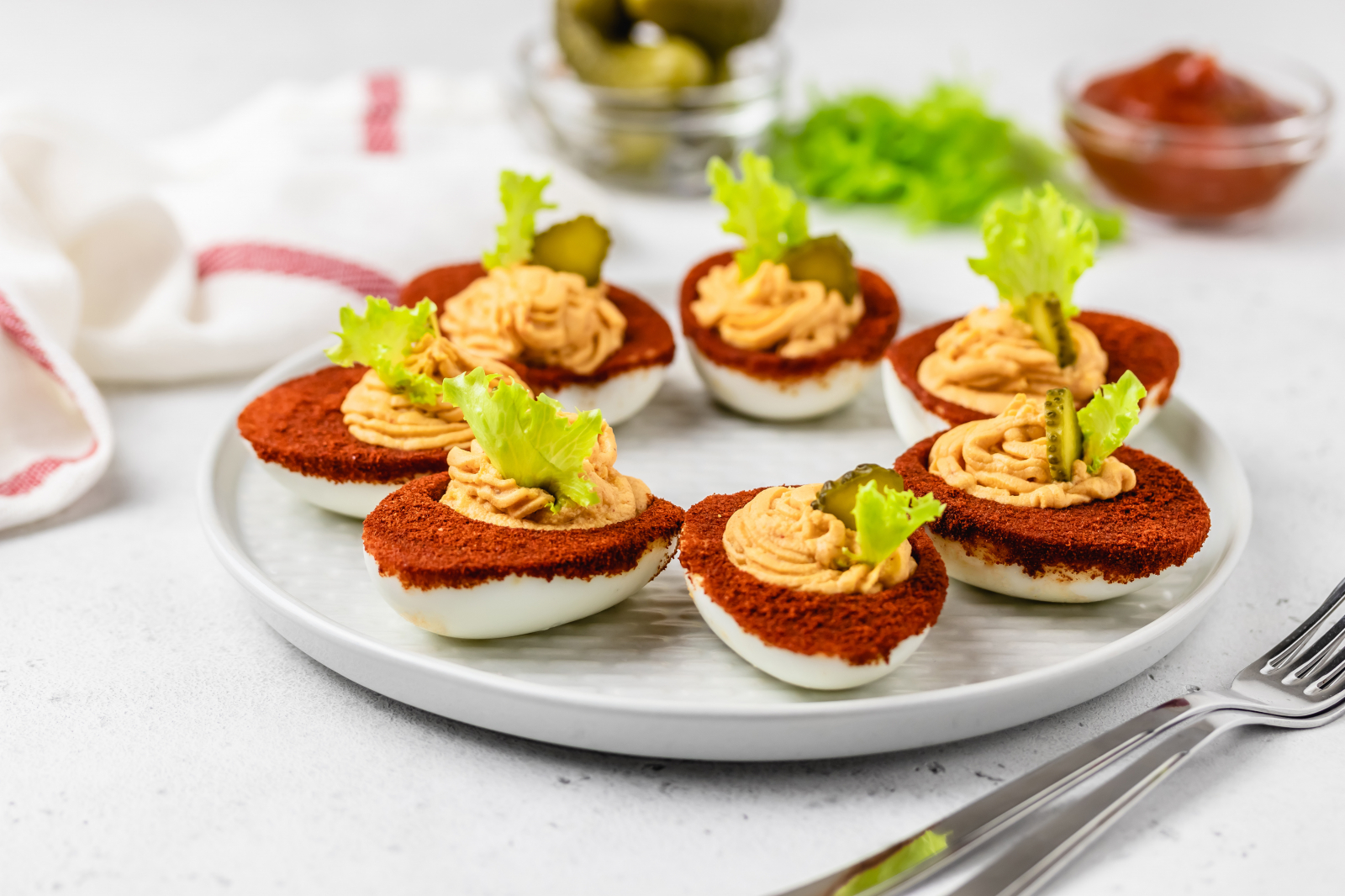 Esta manera de preparar los huevos endiablados los lleva simplemente al siguiente nivel, inspirándose de una bebida refrescante y popular: el Bl oody Mary. Este tentempié es ideal para llevar a un picnic o a una reunión, o simplemente para darse un gusto cuando el hambre ataque.