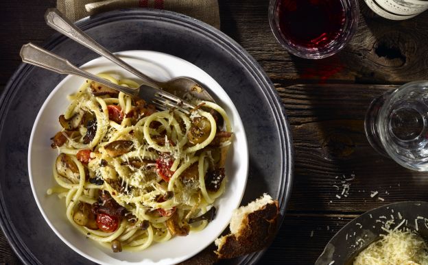 Sirve la pasta con hierbas frescas picadas y parmesano, ya sea en láminas o rallado (excepto si la salsa es a base de pescado, mejillones, gambas etc).