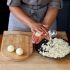 3. Saca pedacitos de la masa (calcula el tamaño teniendo en cuenta que deberían salir ocho), extiéndelos un poco, coloca una bolita de mozzarella en cada uno de ellos y ciérralos alrededor de ella.