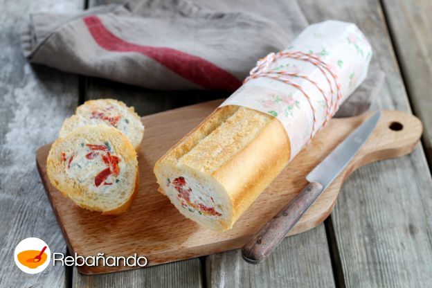 Prepara esta baguette de queso francés y pimientos rojos para un aperitivo que todos recordarán.