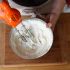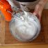 - Mientras tanto, agrega en un tazón la nata espesa y la nata para montar y bate vigorosamente para que esponje.