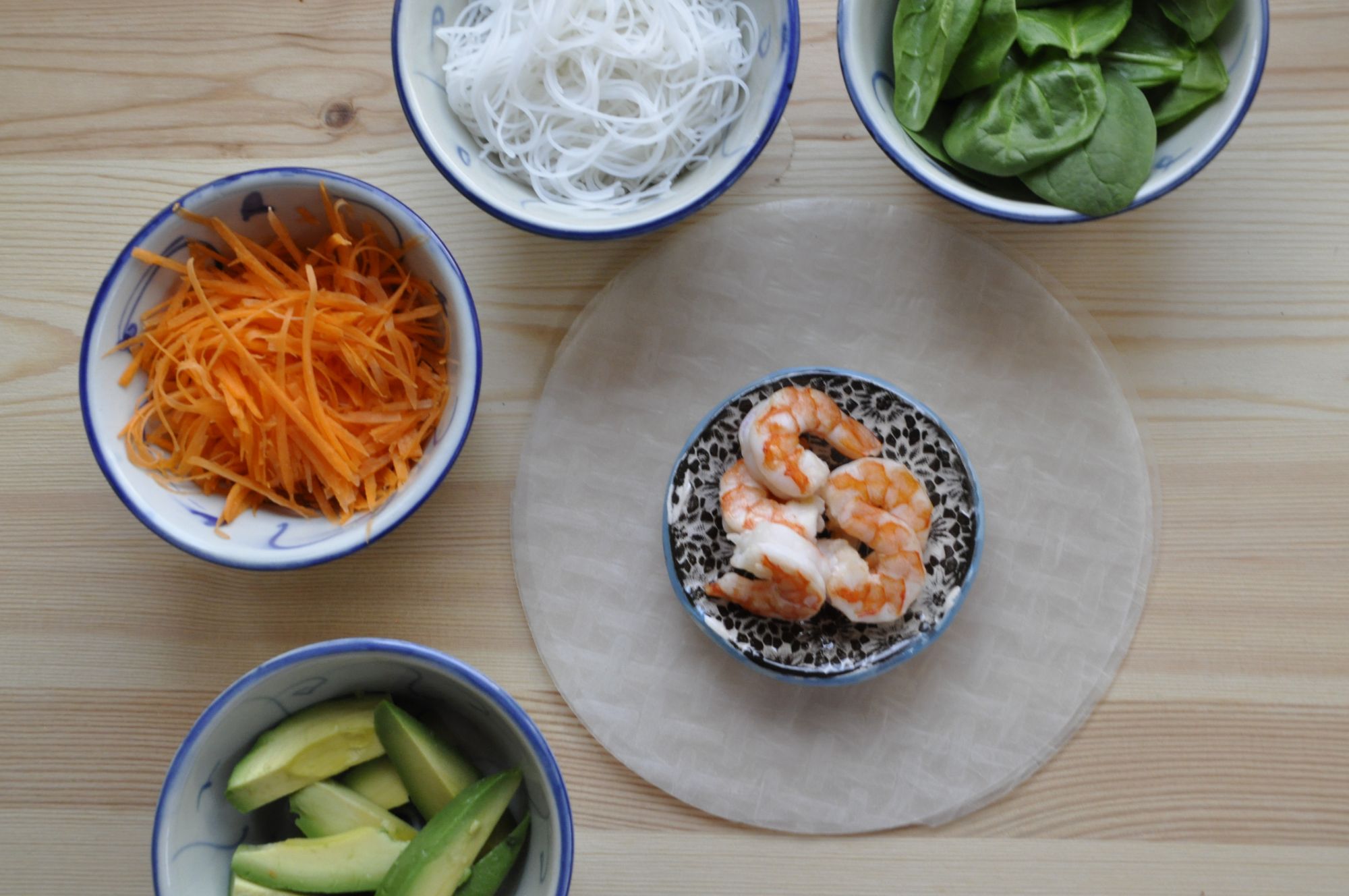 12 hojas de arroz, 2 aguacates, 1 nido de vermicelli de arroz, 12 gambas, 2 zanahorias no muy grandes, 1 puñado de hojas de espinacas, salsa para acompañar los nems (soja, salsa agridulce...)