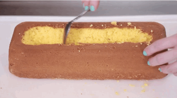 Pasado este tiempo haz un corte en la parte superior del bizcocho y saca un poco de miga para crear un hueco, de esta manera: