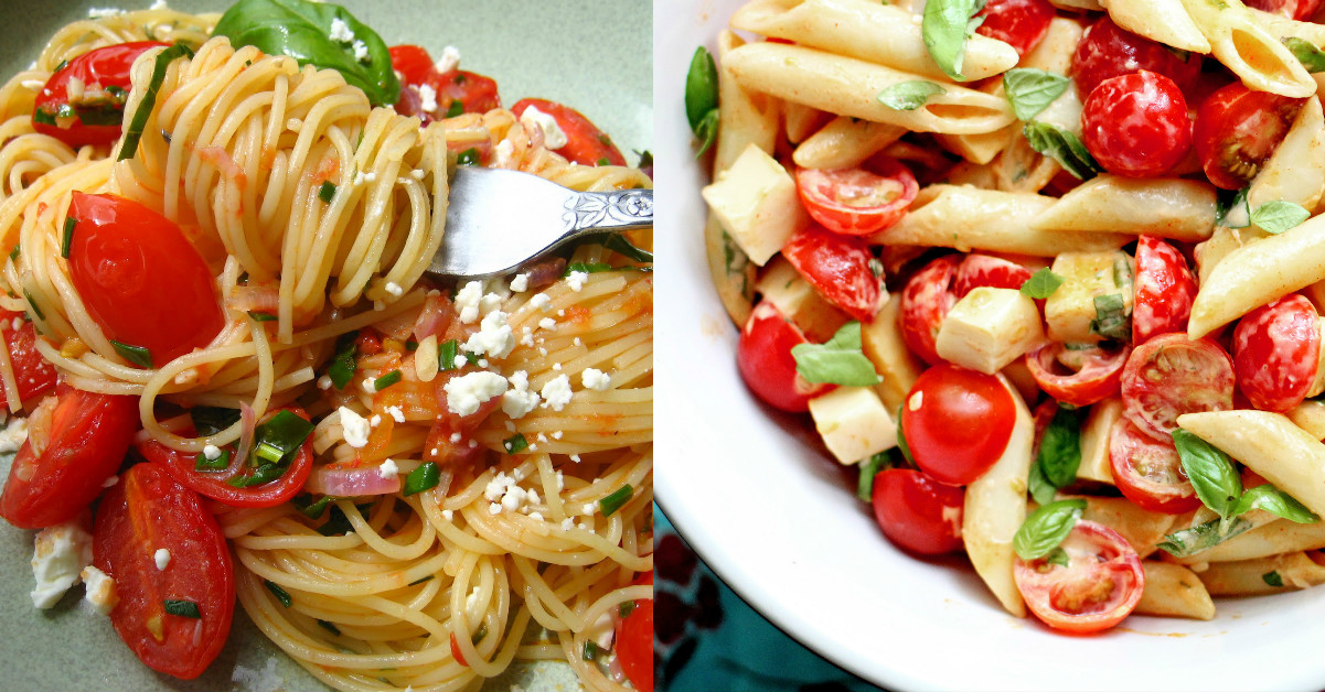 En el menú de hoy tenemos para ti un delicioso espaguetti al dente con tomates cherry y albahaca fresca del jardín. Un platillo nutritivo con carbohidratos, vegetales, un poco de proteína y grasas insaturadas.