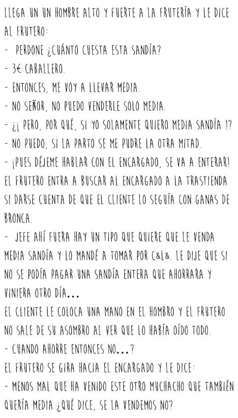 Todo esto por media sandía... DeSalvador Rebañando, 15/09/2014 Rebañando 51 compartidos Compartir en Facebook Twitear Pin it Share on WhatsApp Compartir ¡Descubre recetas increíbles con sandía o macedonia de frutas! Siguiente broma Más artículos recién sacados del horno Pero qué le pasa a la sopa... Comenta este artículo