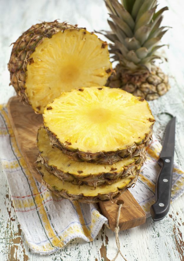 La piña no contiene muchas calorías y sí tiene mucha agua, que ayuda a rehidratar tu organismo. Además, tiene bromelina, que ayuda a prevenir la inflamación y a sanar la hinchazón.