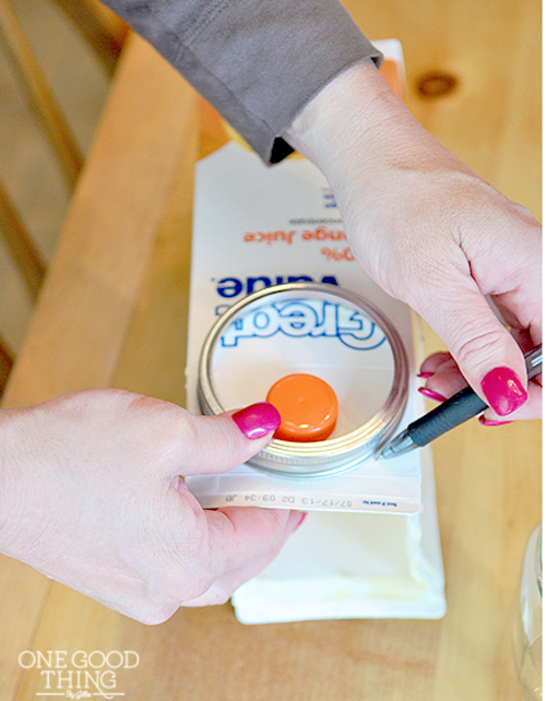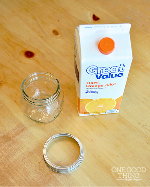Pero empecemos por el principio: nos harán falta un cartón de zumo vacío (o de leche, o de lo que sea), un frasco de vidrio, el anillo exterior de su tapa, unas tijeras y un lápiz.