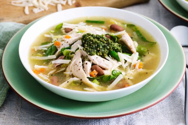- 2 tazas de caldo de pollo con verduras (que contenga 200g de carne)