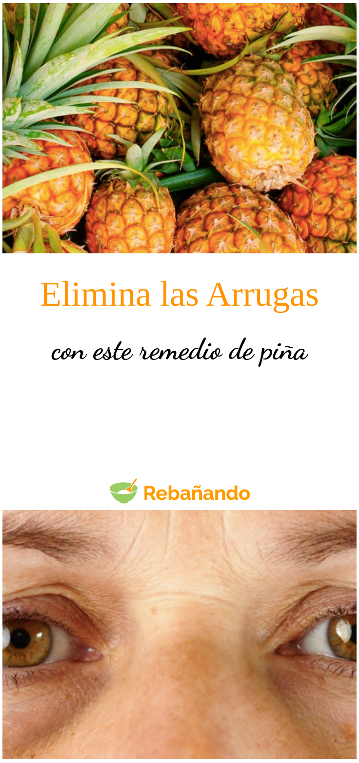 ¿Conoces todos los beneficios que la PIÑA aporta a nuestras vidas? Además de ayudar a eliminar toxinas, aportar vitaminas y cargar nuestro cuerpo de energía; esta fruta sirve también como ingrediente de una mascarilla tachada en la actualidad como milagrosa ya que elimina -como por arte de magia- las ARRUGAS que nos salen alrededor de los ojos. Un remedio casero que queremos compartir contigo para que lo pruebes desde ya. ¡FUNCIONA!