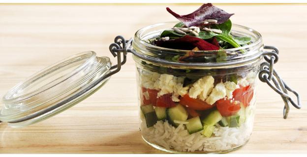 Para conseguir un efecto como el de la foto cuando preparemos una ensalada, la clave está en colocar los ingredientes en capas. La vinagreta la conservaremos en un frasco de menor tamaño como el de las mermeladas y a la hora de comer, solo tenemos que añadirla, remover bien todo y para mayor comodidad, servirla en un plato a parte.
