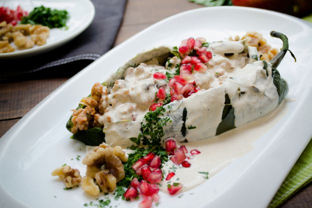 Para la salsa, licua 1 lata de crema light con 1 taza de nueces, 1 sobre de Stevia, 1 cdta de canela y 1 pizca de sal. Ahora sí, pela los chiles, retira las semillas, rellena con picadillo y baña en salsa. Agrega un puñado de granada fresca a cada chile y un poco de perejil finamente picado.