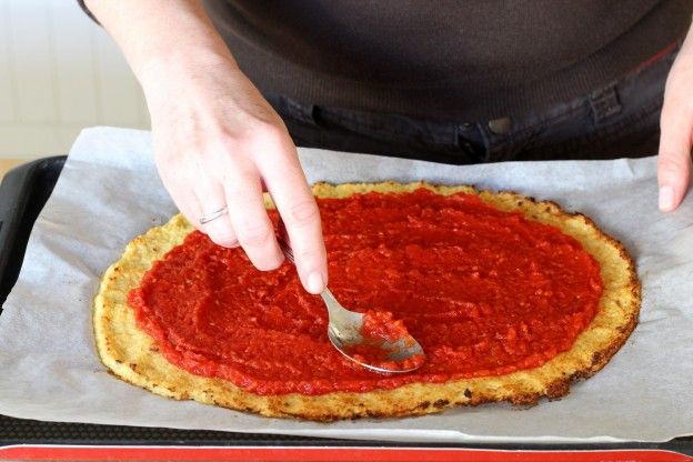 Extender la salsa por toda la masa con la ayuda de una cuchara.