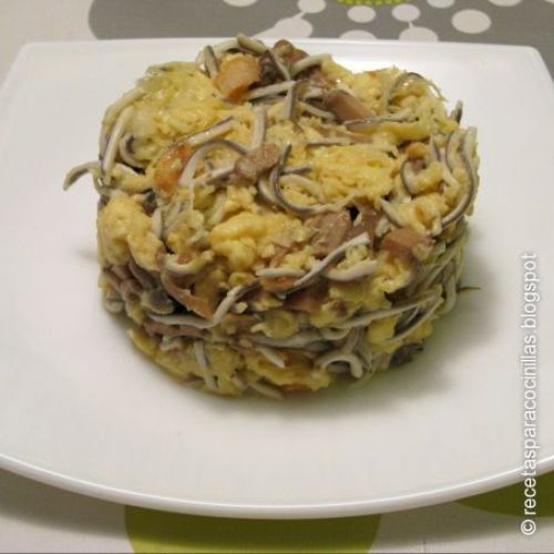 Prepara este revuelto de gulas y champiñones, ya sea como plato principal o como entrante, servido en porciones más pequeñas.