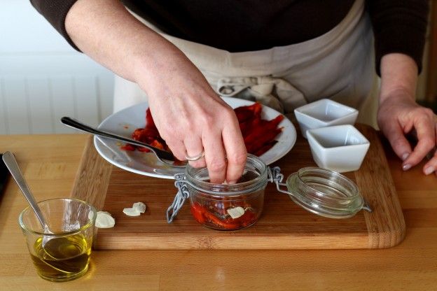 Le añadimos dos láminas de ajo, o si nos gusta mucho, lo rayamos encima de la primera capa de pimiento.