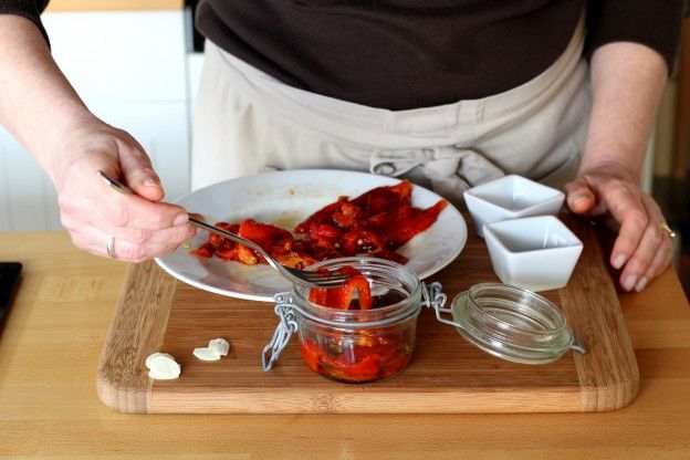 Ponemos una nueva capa de pimientos que cubra bien todos los condimentos que hemos echado sobre la primera.