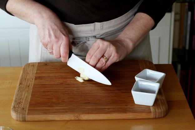 Con ayuda de una tabla de madera cortamos en rodajas finas, ya que lo que queremos es condimentar los pimientos pero sin quitarles su sabor.