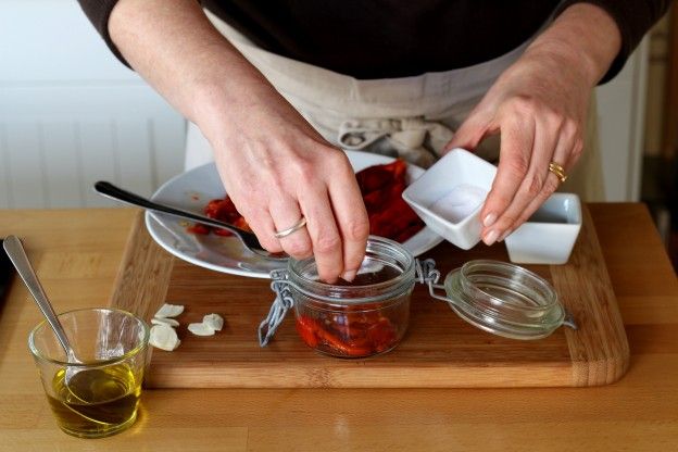 Cuando tengamos bien cubierto el fondo del tarrito con la primera capa de nuestros pimientos, echamos una pizca de sal según nuestro gusto.