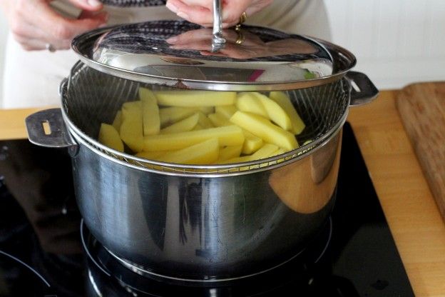 Las tapamos y las dejamos cocer entre 12 -15 minutos. Las patatas deben quedar tiernas a los lados pero algo más duritas en el centro. Esta manera de cocción permite que la patata suelte el almidón y de esta manera pueda absorber el aceite que le hará estar más doradita.