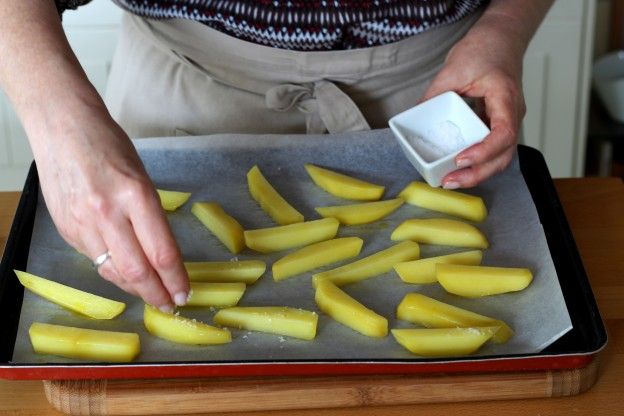 Distribuimos bien las patatas por toda la bandeja del horno y las sazonamos con una pizca de sal, al gusto.