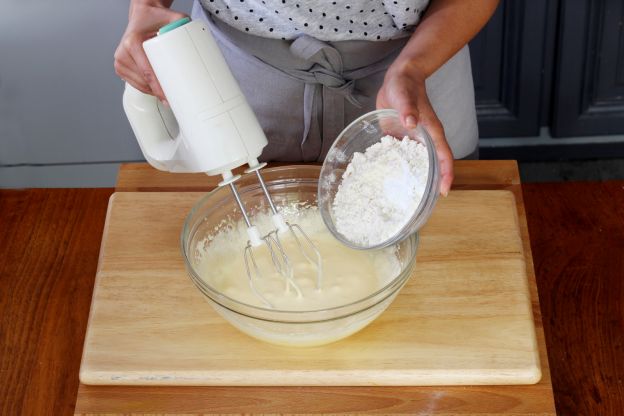 Agrega el harina tamizada con el polvo para hornear y el cacao en polvo. Agrega el aceite e incorpora suavemente con una espátula.