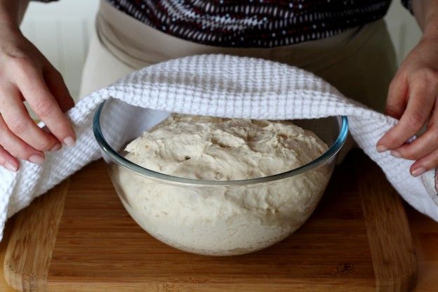 A mano : En un bol, mezclamos la harina, la sal y el azúcar.  Hacemos un huequito en la masa, y añadimos el aceite, la levadura, el yogur, y la mitad del agua.  Amasamos a manos, y vamos echando agua poquito a poco y alisamos la masa. Doblamos la pasta y cubrimos el bol con un paño para dejarlo reposar.