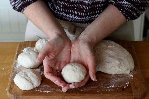 Echamos la masa en una superficie en la que previamente hemos puesto harina para que no se pegue, y la dividimos en 10 trocitos. Amasamos hasta formar 10 bolitas de masa.