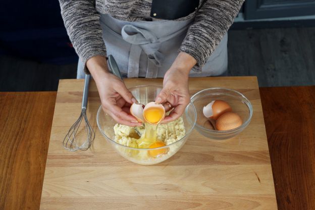 Precalentar el horno a 180° C .  Mezclar la manteca con el azúcar en un bowl, luego agregar el polvo de almendras y los huevos, de a uno, removiendo constantemente a cada incorporación.
