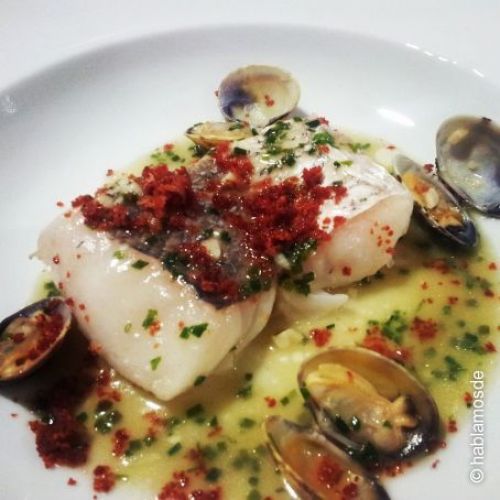 Si la foto no te convence, nada más el nombre de esta merluza en salsa verde, vinagreta de almejas y polvo de jamón debería ser suficiente para convencerte de que es un platillo digno del mejor de los restaurantes.