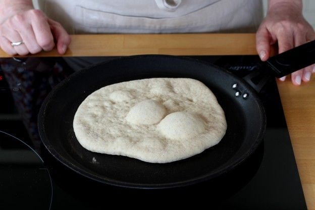 Calienta una sartén a fuego fuerte o alto y sin materia grasa. Echa un primer círculo de masa.