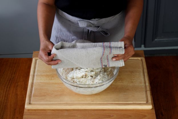 Espolvorea la masa con un poco de harina, cubre el bol con un paño limpio y húmedo y déjala reposar durante una hora a temperatura ambiente. Pasado este tiempo, el volumen de la masa debería haberse duplicado.