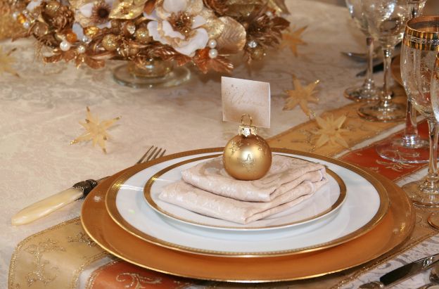 Coloca la vajilla alternando platos de distintos tamaños y haciendo combinaciones de colores, como blanco y dorado o azul y plateado.
