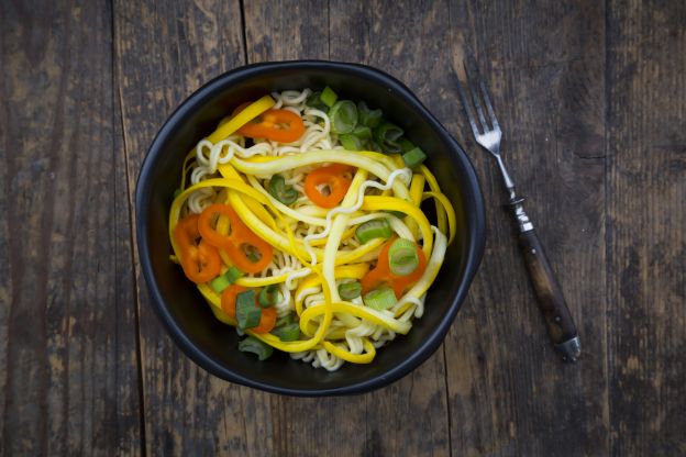 Espaguetis de calabacín amarillo, fideos soba y pimientos