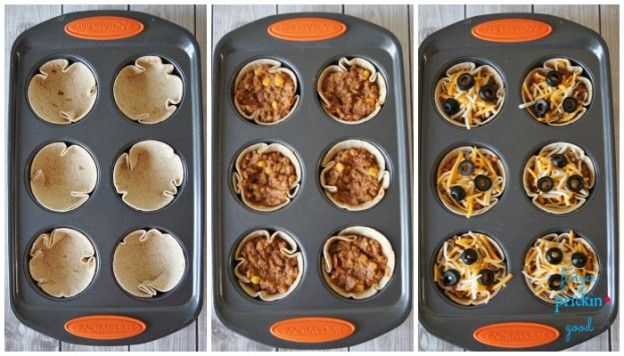 Corta con ayuda de un vaso diferentes discos en una masa de pizza bien fina o utiliza las típicas tortillas mexicanas de maíz. Colócalas en los moldes de muffins y echa los ingredientes que más te gusten. Hornea y ¡listo!