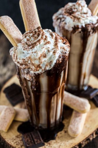 Una manera muy original de disfrutar de un fresco tiramisú es en forma de batido. Un postre muy vistoso para terminar una comida con hamburguesas gourmet,  para compartir una tarde con amigas o para consentir a tu familia un fin de semana en casa. Para prepararlo, bate en la licuadora 2 bolas de helado de vainilla, 2 vasos de café con leche (si es para niños puedes utilizar aroma de café u omitirlo), 3 cdas de queso mascarpone y 4 galletas de soletilla. Sirve con nata montada, jarabe de chocolate, canela en polvo y galletas.