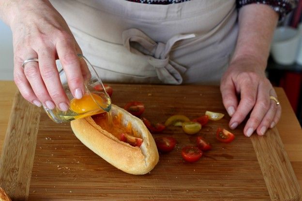 Rompemos el huevo y lo echamos en un vasito pequeño. Después desde ahí, lo vamos a echar con mucho cuidado en el interior del panecillo. Lo mismo haremos con los otros 3 panecillos, y los otros 3 huevos.