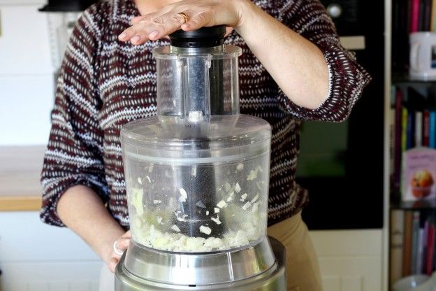 Después pelamos el ajo y la cebolla, y los metemos en la picadora anta que nos queden bien chiquititos.