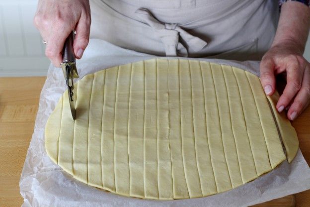 Con ayuda de un cuchillo para cortar las pizzas, vamos a cortar la primera pasta.