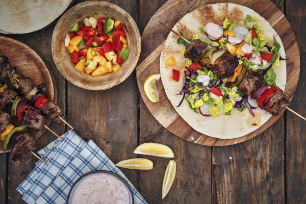 Para el emplatado: coloca un pan pita sobre el plato, agrega la ensalada al gusto y coloca en medio una brocheta.