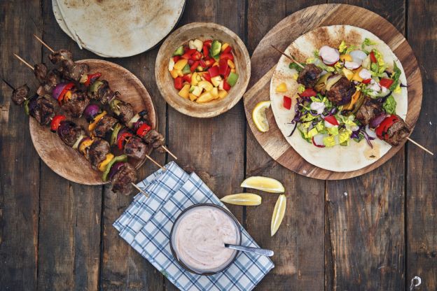 Kebab de ternera con verduras asadas